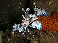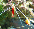 Un exemple d'espèce de l'infra ordre des Stenopodidea : Stenopus hispidus. En contexte général, ces crustacés décapodes rappellent les crevettes vraies, mais évoquent plutôt une langoustine sur de nombreux points morphologiques. |